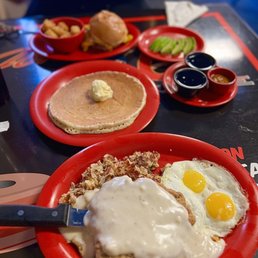 The chicken fried steak breakfast oh my God to die for it is delicious. Best breakfast in the area. The servers are so polite. Biscuits and gravy, fluffy and creamy and also so delicious Oh, and get the habanero hot sauce. Very tastey and calinente !!